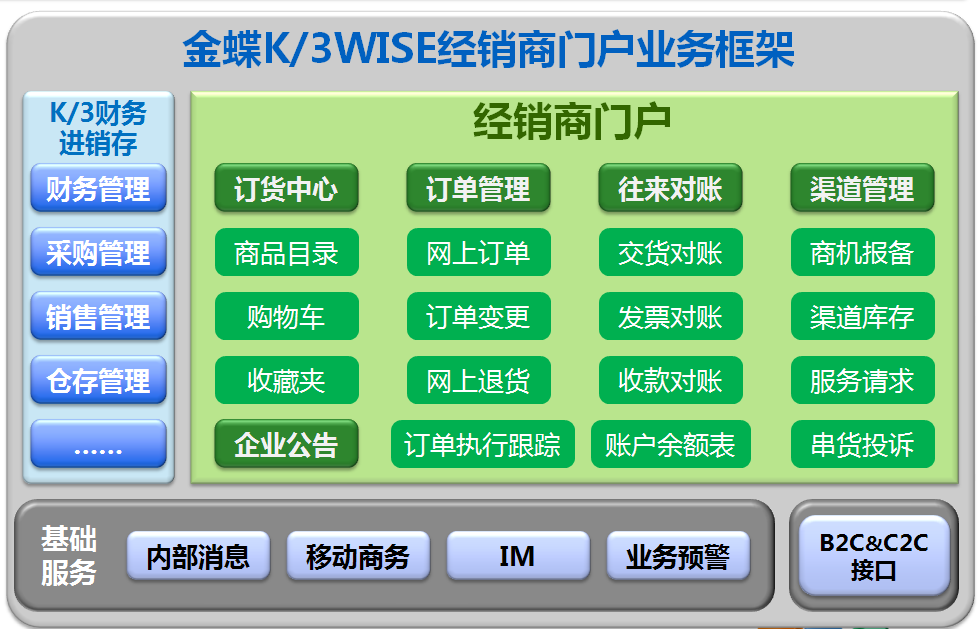 經銷商管理系統(tǒng)主要以K/3WISE經銷商門戶模塊為主,介紹經銷商如何通過經銷商門戶進行溝通、訂貨、退貨、對賬等,形成金蝶K/3WISE經銷商門戶解決方案。