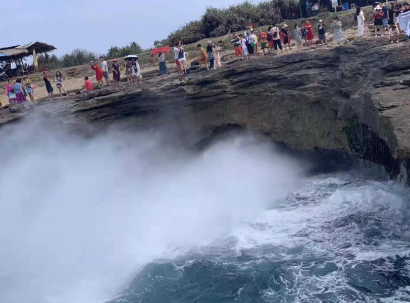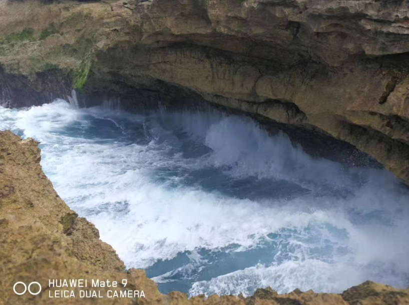 惡魔的眼淚是一個(gè)小的懸崖,但因?yàn)槌D甑暮K疀_刷,形成了一個(gè)開口圓形的形狀。懸崖底端也有被海水沖刷出的洞穴,因?yàn)閴簭?qiáng)的擠壓,漲潮的時(shí)候海浪在這里被沖出幾十米高。我們運(yùn)氣很好看到在陽光折射下水霧中的彩虹,而且還拍了不少美麗的照片。