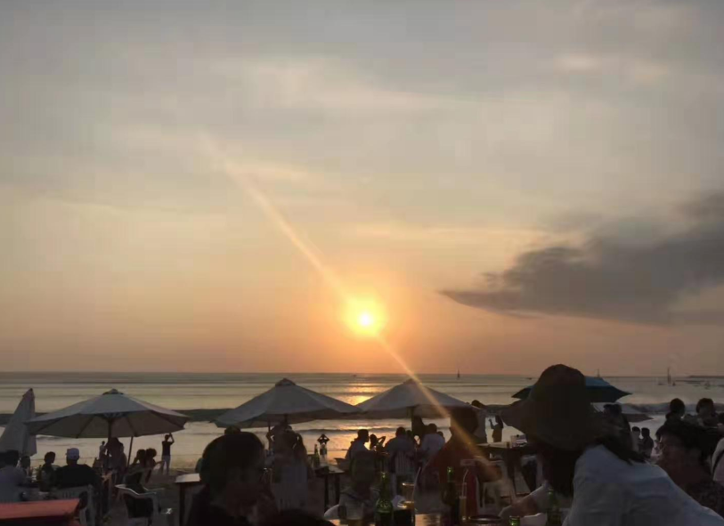 最后一站仍是海邊,而且,是擁有全球十大最美落日之一的金巴蘭海灘。傍晚的金巴蘭,夕陽斜斜地掛在海天一線的地方,云層和海水被染得金黃,一層層地變換著顏色,滿目金黃,即使是不太感性的我也為之驚嘆不已。右前方的海灘上,一條機(jī)場(chǎng)跑道筆直延伸入海,銀色的飛機(jī)不斷起降,在斜陽的照耀下劃出一道道美麗的弧線。沙灘上,一桌桌的盛宴已經(jīng)一字排開,就等著我們入席了。當(dāng)晚恰逢我們家駒哥哥的生日,同事們紛紛為他送上祝福。燭光搖曳,海風(fēng)輕柔地?fù)崤骖a,靜靜地,看夕陽一點(diǎn)點(diǎn)地落入海中,此時(shí)此刻,吃什么已不再重要。難忘的,最是那一抹夕陽醉了的溫柔。
